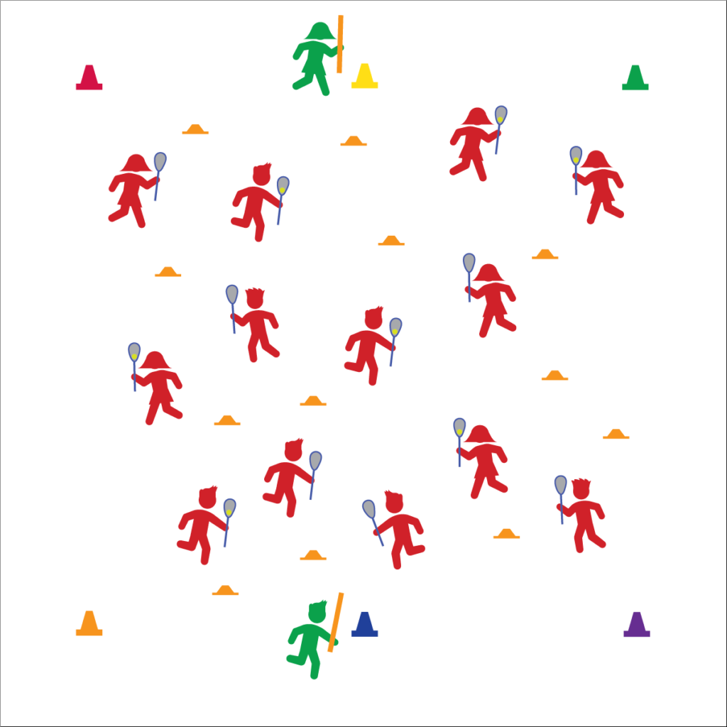 - Create a large activity area using 6 cones; 4 cones in the corners and 2 cones to mark a centerline diving the area in half.